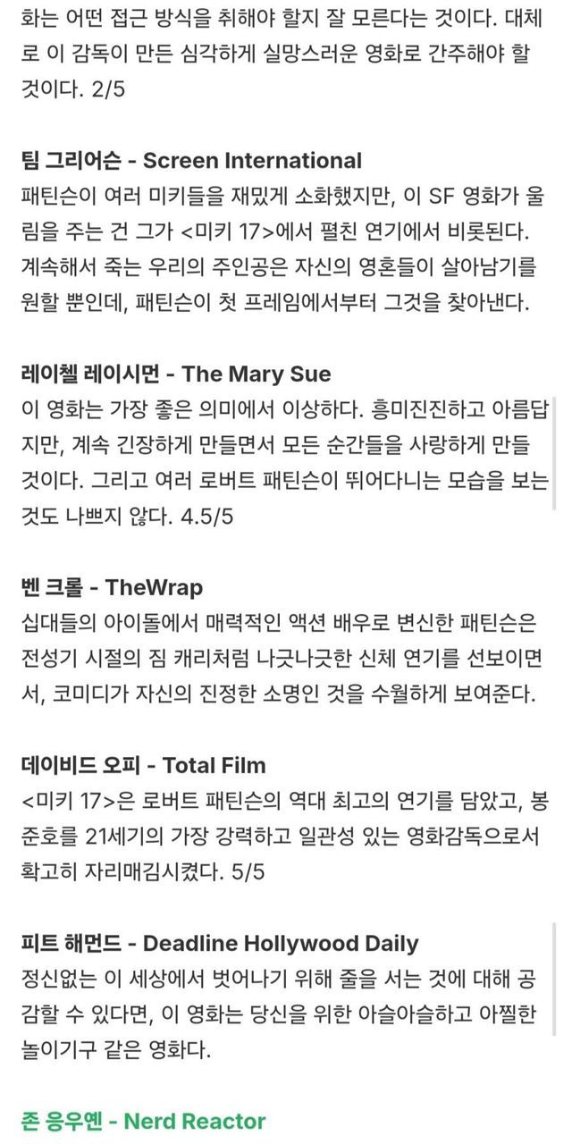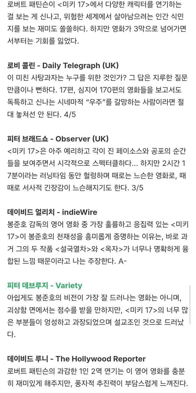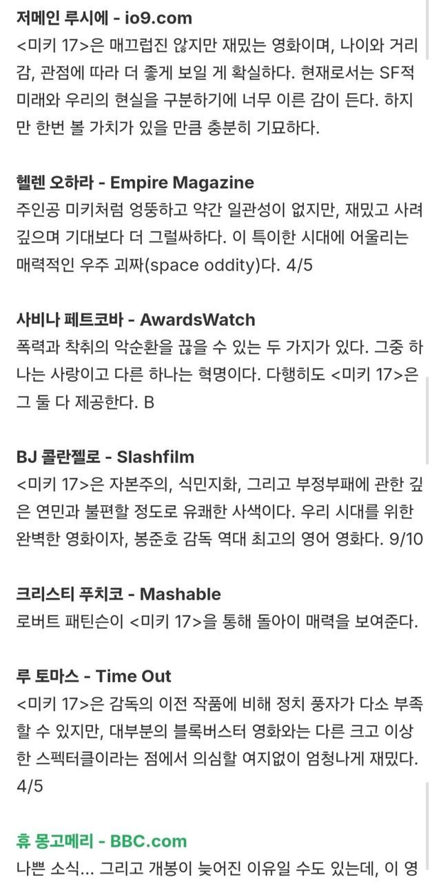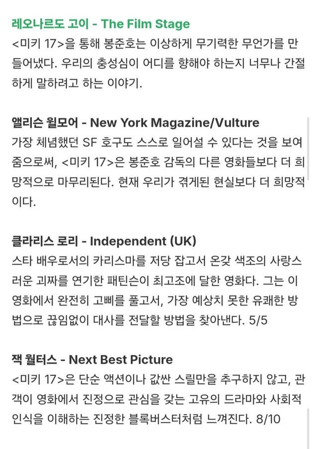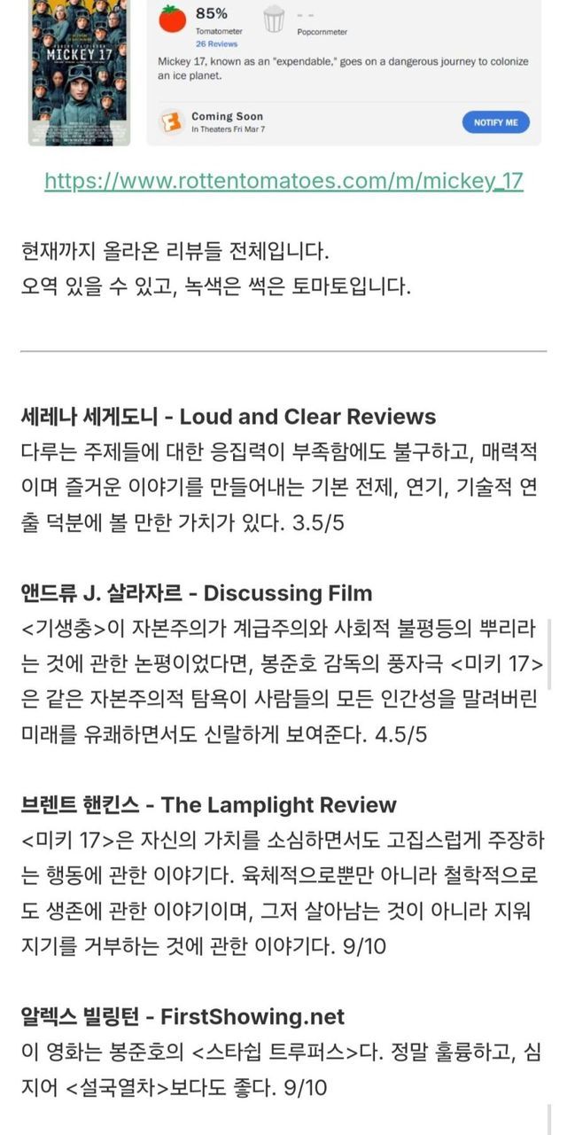 봉준호 감독 신작 '미키17' 로튼토마토 반응