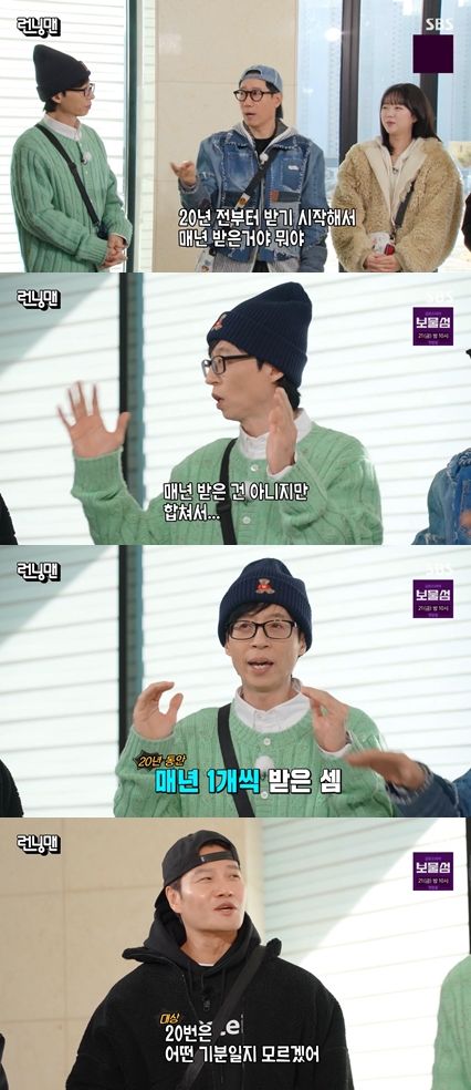 그런가 하면, 지석진은 "20년 전부터 받기 시작해서 매년 받은 거냐"라며 혀를 내둘렀다. 유재석은 "매년 받은 거는 아니지만 합쳐서 20년 동안 스무 개를 받은 거다"라고 설명했다.