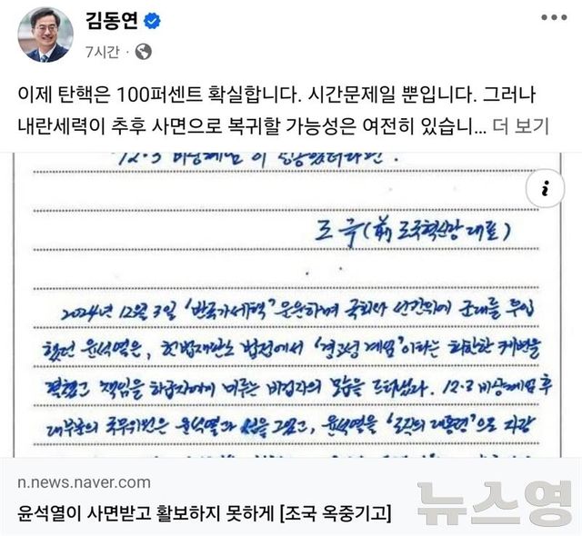 김동연 지사는 16일 자신의 SNS 페이스북을 통해 “이제 탄핵은 100퍼센트 확실하다다. 시간문제일 뿐”이라면서도 “그러나 내란세력이 추후 사면으로 복귀할 가능성은 여전히 있다”고 우려했다.