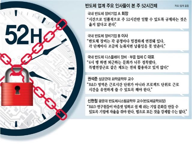 대한상공회의소의 조사를 보면, 주요 기업 연구부서들의 75.8%는 “주 52시간제 시행 이후 R&D 성과가 줄었다”고 답했다. 산업계에서는 반도체특별법 제정과 함께 △노사 합의를 통한 자율적 관리 △근로시간이 아닌 프로젝트 단위의 유연한 규제 등이 필요하다는 목소리가 나온다. 김종훈 산업기술진흥협회 상임이사는 “반도체 등의 R&D 부문은 유연한 근로시간 확보가 필요하다”고 했다.