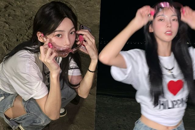 공개된 사진 속 김민지는 화이트 반팔티에 데님팬츠를 입고 밤바다 앞에서 여유를 즐기고 있는 모습이다. 필리핀을 방문한 김민지는 'I♥Philippines'이라 적힌 티셔츠를 입은 채 핑크 고글을 착용하는 등 남다른 패션 센스를 자랑했다. 어두운 야외에서도 화려한 미모를 잃지 않는 김민지의 모습이 시선을 강탈한다.