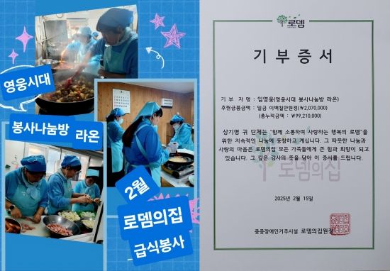 '라온'은 중증장애아동들이 거주하는 '로뎀의집'에 매달 급식비 150만 원과 여러 물품을 후원하고 있으며, 직접 만든 음식을 제공하는 주방 급식 봉사도 진행 중이다.
