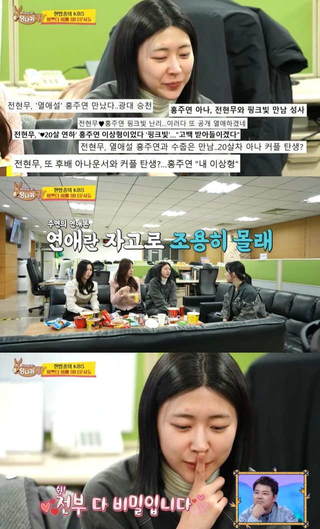이날 아나운서 홍주연은 최근 불거진 '20살 연상' 전현무와의 열애설에 대해 입을 열었다. 홍주연은 "연애란 자고로 조용히 몰래"라며 말을 아꼈다. 이를 VCR로 지켜보던 전현무는 의미심장한 표정을 지어 눈길을 끌었다.