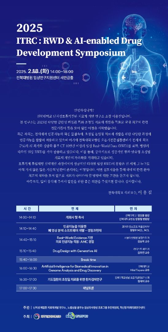 AI와 실세계 데이터(RWD)를 활용한 신약개발과 정밀의료의 미래를 가늠해보는 첫 번째 자리인 이날 심포지엄에서는 코어라인소프트의 장령우 연구원, 서울아산병원 김남국 교수, 카이스트 김우연 교수, 전북대 Hilal Tayara 교수, 전북대병원 정재석 교수 등 국내외 저명한 전문가들이 참여할 예정이다.