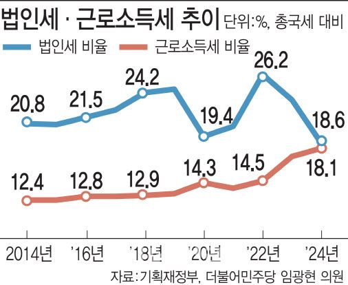 법인세수 비중은 2005년 이후 20%에서 24% 수준을 유지하다가 2020년 19.4%로 줄었다. 이후 다시 2021년 20.5%, 2022년 26.2%로 늘었으나 2023년 23.4%로 축소된 뒤 지난해 다시 10%대로 내려앉았다.