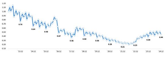 은행 연체율은 2018년 말 0.40%에서 2021년 말 0.21%로 떨어진 뒤 다시 2022년 0.25%, 2023년 0.38%포인트로 다시 상승세를 보이고 있다. 작년 연체율은 0.44%로 2021년과 비교하면 2배 이상 높아졌다.
