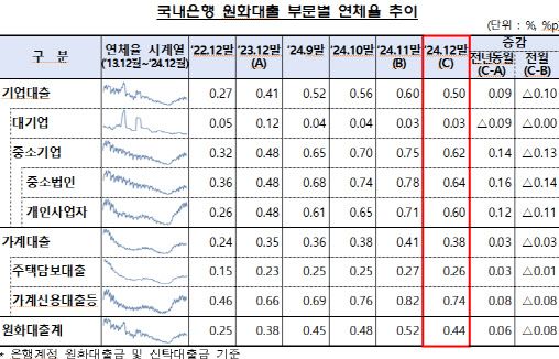 가계대출 연체율도 작년 말 0.38%로 1년 전보다 0.03%포인트 상승했다. 이 기간 주택담보대출(0.26%)은 0.03%포인트, 신용대출 등(0.74%)은 0.08%포인트씩 올랐다.