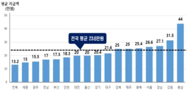 광역지자체 평균으로는 충청남도가 44만 원으로 가장 많은 참전수당을 지급하고 있으며, 이어 강원도(31.5만원), 경상남도(27.1만원), 서울시(26.6만원), 충북(25.4만원) 등의 순으로 조사됐다.