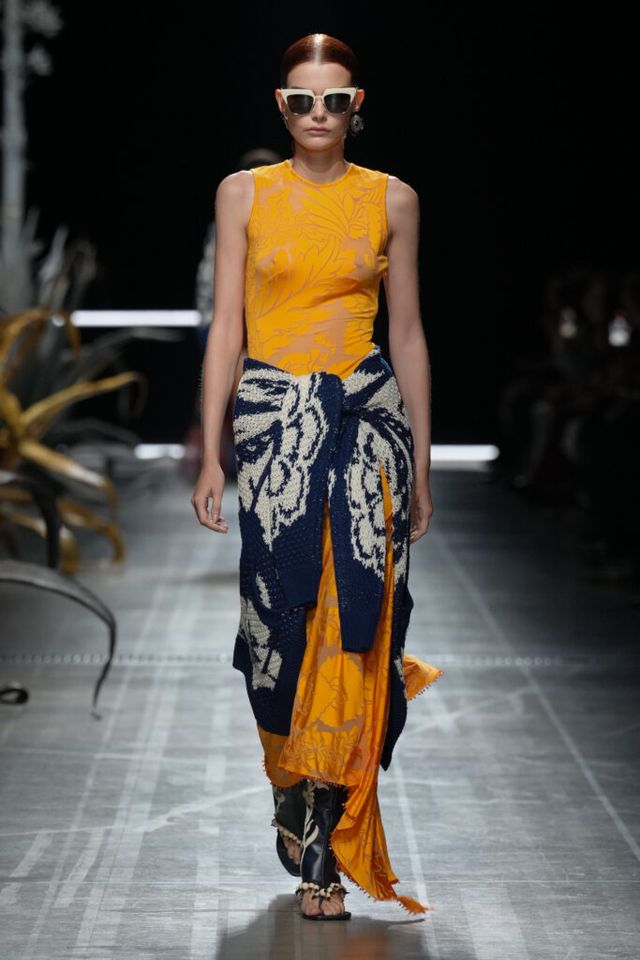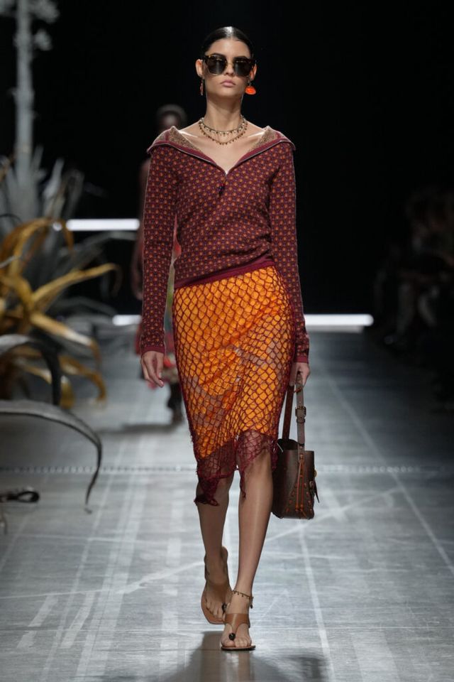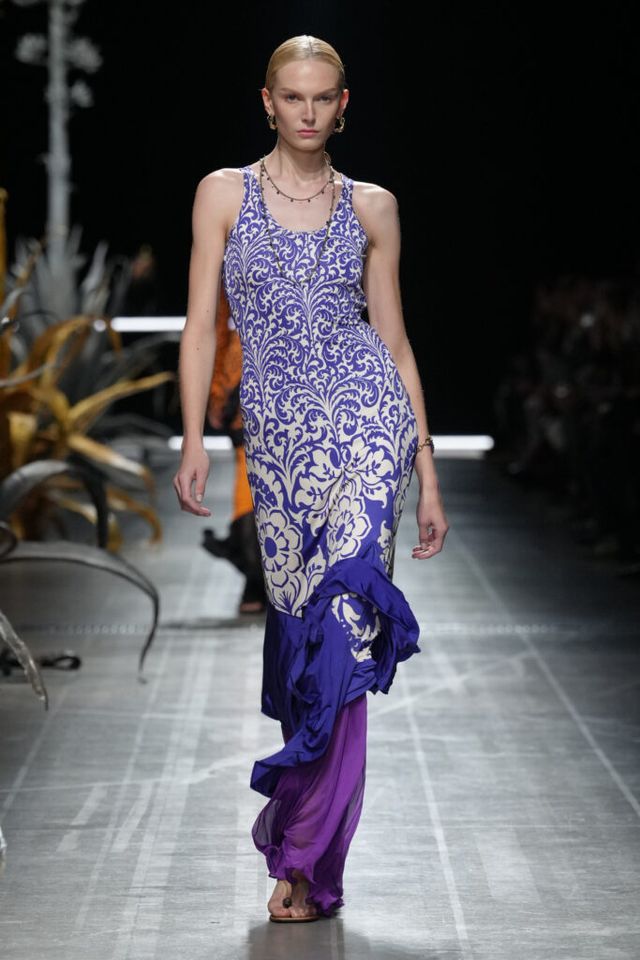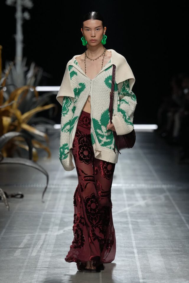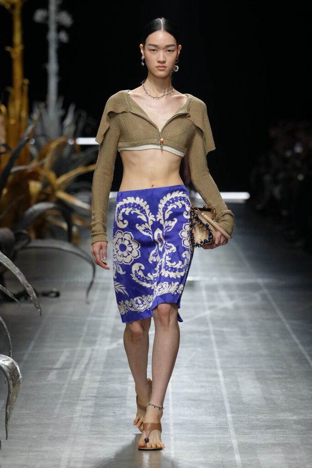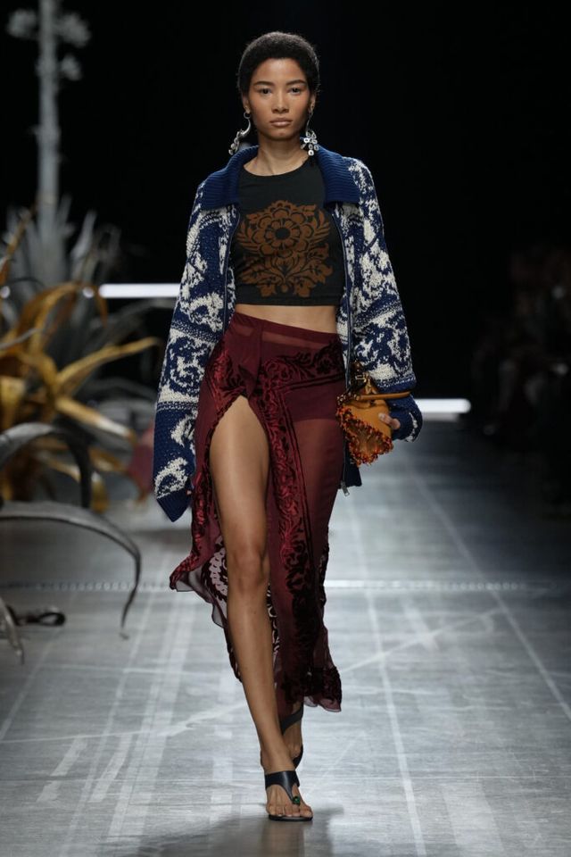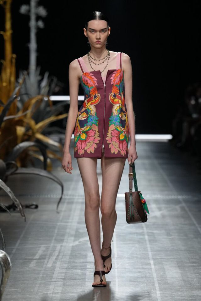 NOTE 마르코 드 빈센조는 여행의 본질이 목적지에 다다르는 것이 아니라 여정 자체에 있다는 사실에 집중했다. 그리고 아가베가 꽃을 피우는 과정을 다양한 프린트로 옷에 녹여냄으로써 그 진리를 시각화했다. 쇼에는 휴양지를 위한 리조트풍 드레스부터 데님 팬츠, 블레이저, 캐주얼한 스커트와 니트웨어까지 다양한 아이템이 등장했고, 그림체가 서로 다른 각양각색의 플로럴 패턴이나 페이즐리 패턴이 모습을 드러내 보는 즐거움을 더했다.