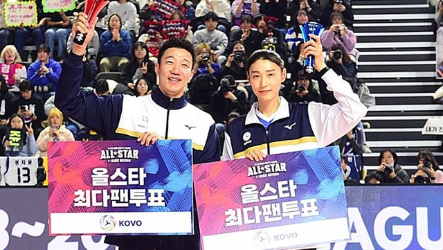 지난해 1월 열린 2023~24시즌 올스타전에서 남녀부 최다팬투표 1위에 오른 김연경(오른쪽)과 신영석이 행사 당일 시상식에서 포즈를 취하고 있다. / 한국배구연맹