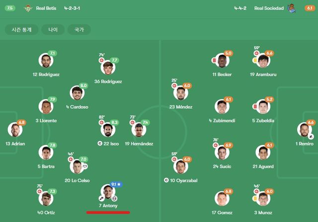 매체는 안토니에게 9.1의 평점을 부여했다. 이는 양 팀 통틀어 가장 높은 평점이었다. '최우수 선수'로 선정됐다. 또 베티스 선수들은 평균 7.5 평점을 받았다. 안토니의 활약이 얼마나 압도적이었는지 점수를 평점을 통해 짐작 가능하다.