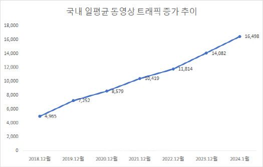 동영상 트래픽 절대 양은 2021년 처음 일평균 1만테라바이트(TB)를 기록한뒤 지속적으로 증가하고 있다. 지난 4분기의 경우는 일평균 1만6498TB로 전년 동기 대비 17.2% 증가했다. 1만TB는 20억장의 사진, 4K 카메라 촬영 영상 6667시간분을 저장할 수 있는 엄청난 양의 데이터다.