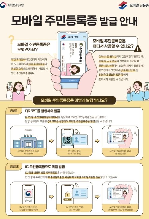 신청 방법은 정보무늬(QR코드)를 통한 발급과 집적회로(IC) 주민등록증 발급 등 두 가지 방식으로 가능하다.