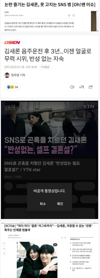 수많은 매체들과 유튜버들이 있겠지만 대표적으로 <디스패치>와 <연예뒤통령 이진호>가 가장 심했다. <스포츠조선>, <YTN>, <OSEN>은 올초에도 김씨가 ‘자숙 기간에 여전히 반성하지 않고 관종 기질’을 드러냈다는 논조로 조롱하는 기사를 내놨다. 분명 과했다. 음주운전 문제와는 하등 관련 없는 김씨의 비연예 활동에 대해 집요하게 악의를 내비친 셈이다. 여자 연예인 갤러리는 “이와 같은 안타까운 일이 반복되지 않도록 사회적 성찰이 필요하다고 생각한다. 근거 없는 비난과 조롱, 악의적인 댓글들은 한 사람의 삶을 송두리째 무너뜨릴 수 있다”고 강조했다.