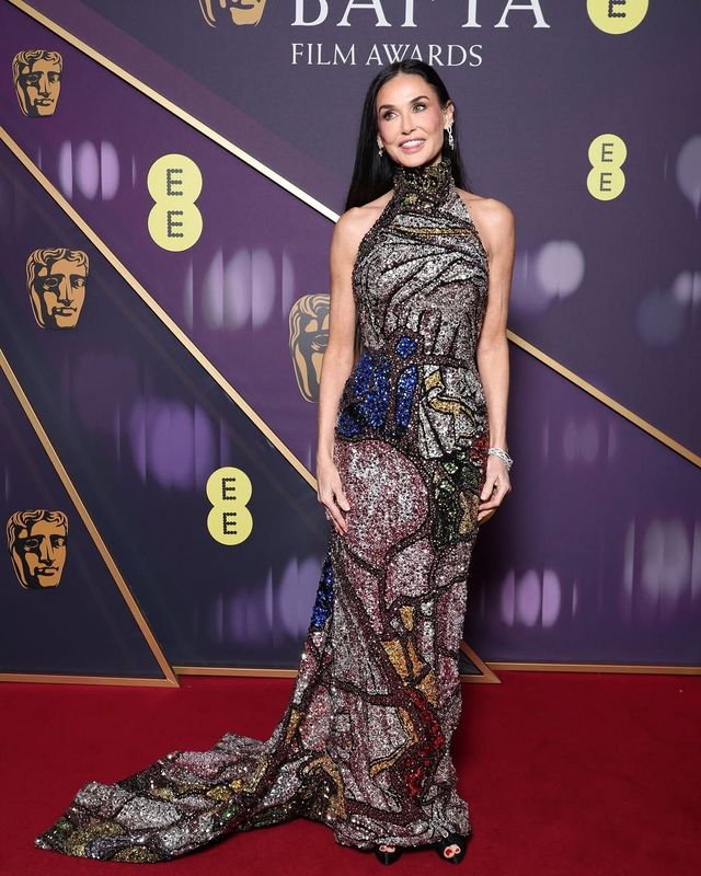 데미 무어는 이번 시상식에서 주얼 장식이 반짝이는 홀터넥 가운을 선택하며 시선을 사로잡았습니다. 그래픽적 디자인이 돋보이는 이 드레스는