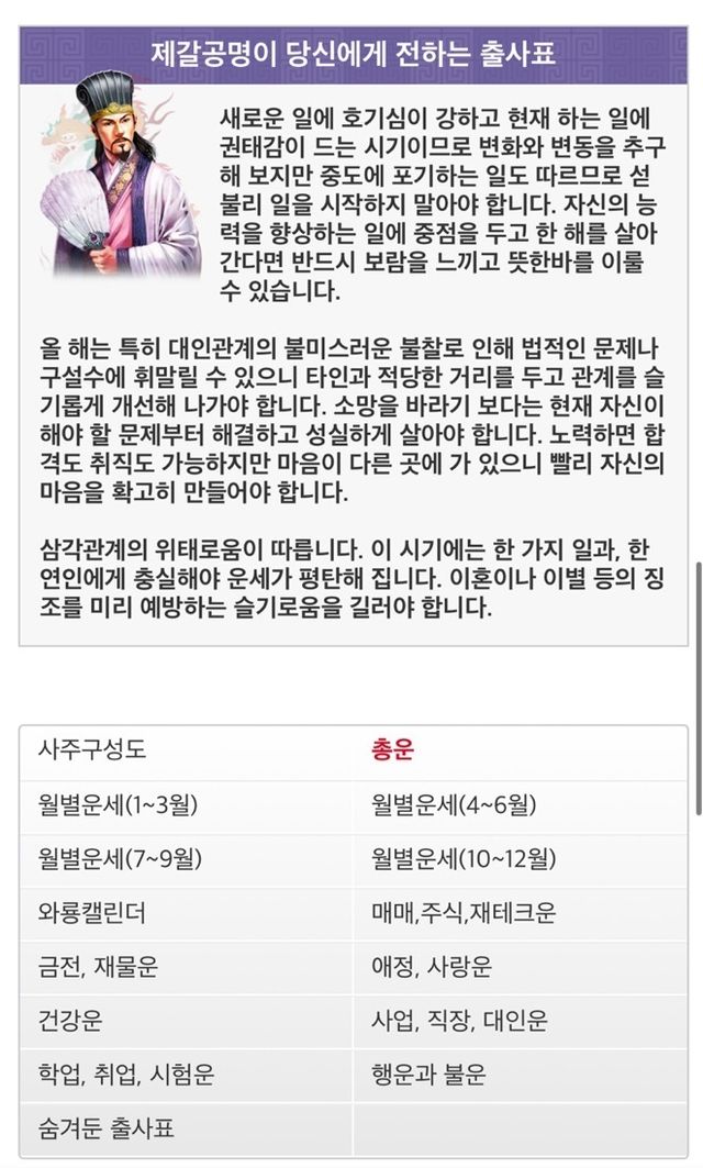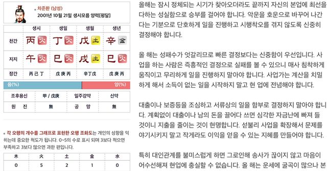 온라인 사주 전문 사이트 '위키사주'는 오랜 전통을 바탕으로 한 사주팔자와 현대적인 분석 기술을 결합하여 각자의 운명을 상세히 분석한다. 이름과 생년월일, 태어난 시간과 성별을 입력하면 간단하게 이용할 수 있다. 만사형통 내 운명의 비밀 사주, 쓸모있는 사주 감정, 복잡한 세상 편하게 사는 소름돋는 비법 사주까지 다양한 운세를 재미있게 점칠 수 있다.