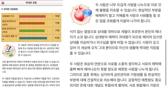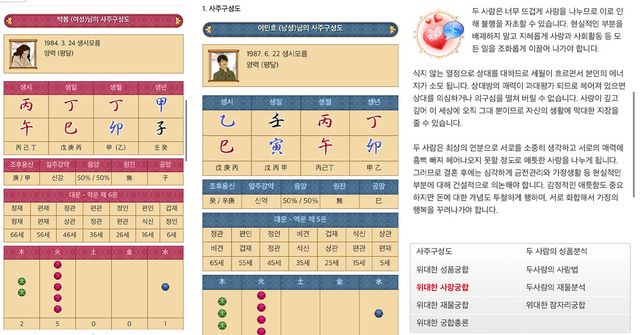 사주 전문 플랫폼 '위키사주'에 따르면 두 사람은 만나게 된다면 서로 장점을 부각시키고 단점을 보완해주는 아량을 길러야 한다. 금전적인 측면은 좋으나 사소한 언쟁과 다툼으로 시간을 낭비하게 되는 만남이다. 마음을 합치고 지성으로 노력해야 다툼을 막고 그로 인한 이별을 예방할 수 있다. 당장 숨이 막히는 의견대립을 인내로 뛰어 넘어야 하며, 건설적인 앞날을 위해 의기투합해야 한다. 여자는 결혼은 연애에 그치는 이성적인 사랑만으로 완성할 수 없음을 빨리 깨닫고 인내와 이해를 길러야 한다.