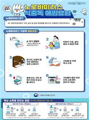 ① 손 씻기 생활화(흐르는 물에 비누로 30초 이상 손씻기) ② 채소류는 염소계 소독액에 5분간 담근 후 수돗물 3회 이상 세척, 어패류는 중심온도 85℃, 1분 이상 조리 ③ 조리 종사자 구토 등 증상 발생 시 2~3일간 조리에 참여하지 않기, 어린이 증상 시 등원 자제 ④ 구토물 및 주변 즉시 소독, 문고리, 손잡이 등 소독 철저 ⑤ 구토물이 묻은 옷은 단독 고온 세탁(50℃ 이상) |