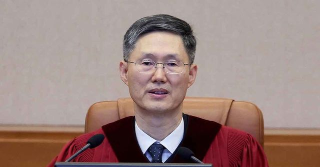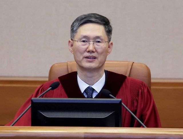 문형배 헌법재판소 소장 권한대행이 17일 오후 서울 종로구 헌법재판소 대심판정에서 열린 이창수 서울중앙지검장, 조상원 중앙지검 4차장, 최재훈 중앙지검 반부패수사2부장 탄핵 심판 첫 정식 변론에 참석해 자리하고 있다. / 뉴스1(공동취재)