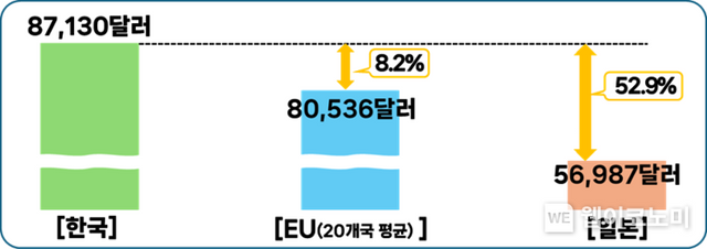 (한‧일‧EU 대기업 임금수준) 우리 대기업 연 임금총액(초과급여 제외)은 87,130달러로 EU 20개국 대기업 평균 80,536달러보다 8.2%, 일본 대기업 56,987달러보다는 52.9%나 높았다. 분석 대상 22개국 대기업 중 우리나라(87,130달러)가 5번째로 높았다(2022년, 구매력평가환율 기준).