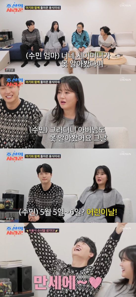 제작진은 "팔복이 정확하게 예정일이 언제냐"라며 궁금해했고, 이수민은 "(출산 예정일은) 5월 5일, 6일 그때다. 어린이날. 딸이다"라며 밝혔다. 원혁은 "만세"라며 기뻐했고, 이용식은 "기도를 많이 했다. 첫 손녀를 키워보고 싶었다. 수민이를 키워봤기 때문에 수민이가 어떻게 자라는지 그 과정을 알지 않냐. 그대로 손녀를 하나 키우고 싶었다. 근데 손녀라고 하니까 엄청나지. 기다렸던 손녀가 오는 거다"라며 털어놨다.