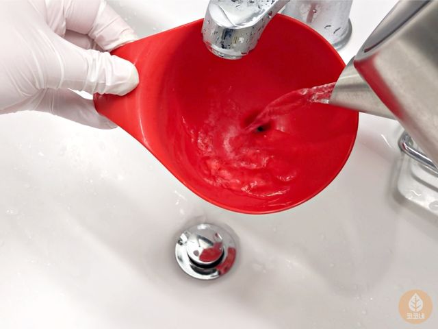 깔때기 대고 천천히 물을 흘려보내 주세요.