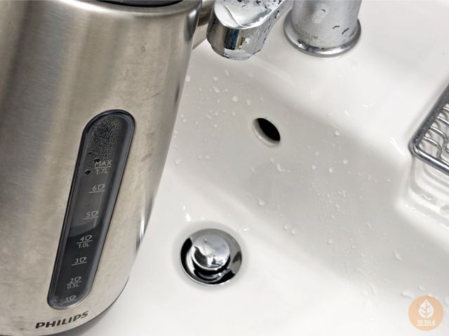 전기포트로 끓인 다음 약간 식혀서 부었어요.