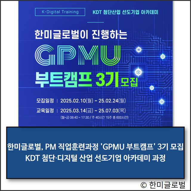 한미글로벌(053690)이 디지털 융합 건설사업관리 실무 인재 양성을 위한 'GPMU 부트캠프' 3기 수강생을 오는 24일까지 모집한다.