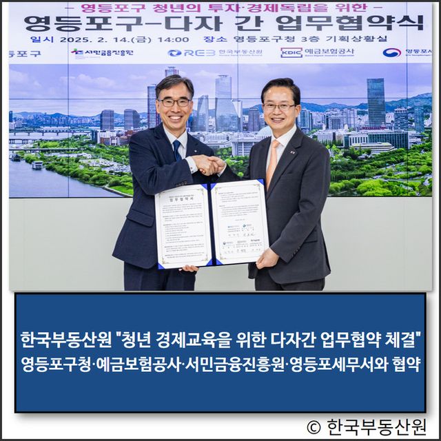 한국부동산원이 지난 14일 영등포구청, 예금보험공사, 서민금융진흥원, 영등포세무서와 함께 '청년의 올바른 투자와 경제적 독립을 위한 업무협약(MOU)'을 체결했다.