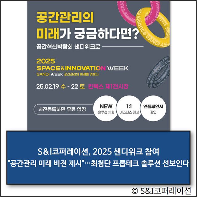 프롭테크 기반 종합 부동산관리 기업 S&I코퍼레이션(이하 S&I)이 오는 19일부터 22일까지 일산킨텍스(KINTEX) 제1전시장에서 '공간혁신박람회 2025 샌디위크(SANDI WEEK; SPACE AND INNOVATION WEEK)'에 참여한다.
