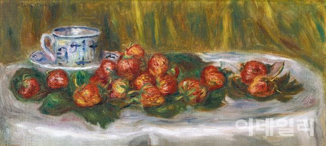 국내 미술시장에는 자주 등장하지 않는, 서구 인상주의를 대표하는 작가 피에르 오귀스트 르누아르(1841∼1919)의 회화작품이 먼저 시선을 붙든다. ‘딸기가 있는 정물’(Nature Morte aux Fraises 1905, 50.2×23.5㎝)이다.