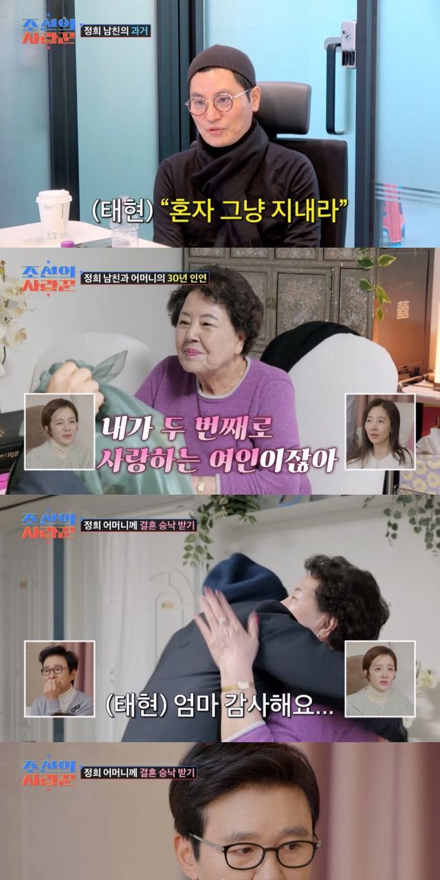 17일 방송된 ‘조선의 사랑꾼’에서는 서정희의 6살 연하 남자친구 김태현이 서정희의 어머니께 결혼 승낙을 받으러 떠났다. 서정희의 어머니와 미국에서 가족처럼 같이 지냈지만, 결혼 이야기는 꺼낸 적 없었던 김태현은 약간의 우려를 표했다. 이에 김국진은 “좋아하시지 않을까? 수지 아버님도 수지의 결혼을 되게 좋아하셨다”며 강수지와의 추억을 떠올렸다. 한편, 서정희가 엄마에게 올 때 항상 과일과 꽃 등을 선물한다며 핀잔을 주자 김태현은 “내가 세상에서 두 번째로 사랑하는 여인이다”라고 맞받아쳐 감탄을 자아냈다. 서정희의 어머니는 “내가 태현이를 30년 가까이 알았는데, 아들보다 더 알고 아들같이 생각했다”라며 “너(서정희)보다도 내가 태현이 속을 더 잘 안다”고 김태현과의 친밀감을 드러냈다.