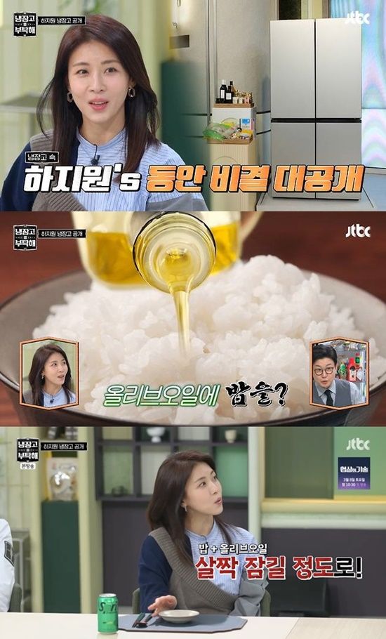 또 하지원은 "치즈를 샐러드 또는 밥 위에 뿌려먹기도 한다. 올리브오일에 밥이 살짝 잠길 정도로 말아서 먹는다"고 말해 놀라움을 안겼다.