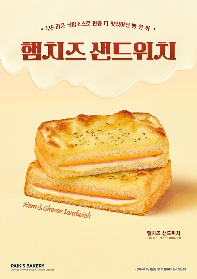 이번 '햄치즈 샌드위치'는 빵 사이에 프레스 햄과 모짜렐라 치즈를 넣고 특제 베샤멜 소스를 듬뿍 발라 완성한 프렌치 스타일의 샌드위치다. 부드러운 크림 풍미의 베샤멜 소스가 짭조름한 햄과 고소한 치즈를 감싸 입안 가득 깊은 맛을 선사한다.