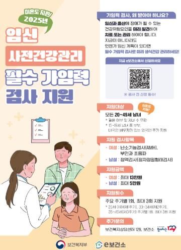 ‘임신 사전건강 관리 지원사업’은 임신 및 출산 고위험 요인을 조기에 발견해 체계적으로 관리할 수 있도록 필수 가임력 검사비를 지원하는 사업이다.