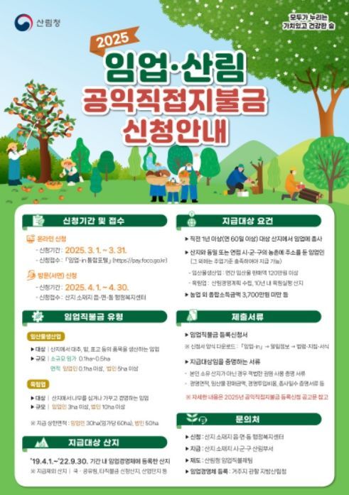 [와이뉴스] 산림청은 2025년 임업‧산림 공익직접지불금 신청접수를 3월 1일부터 4월 30일까지 실시한다고 밝혔다.