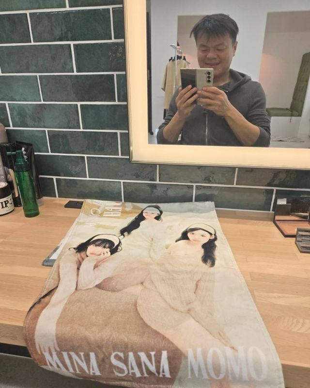 공개된 사진 속에는 '미사모' 멤버 미나, 사나, 모모가 그려진 커다란 타올이 놓여져있고, 이를 사진으로 찍는 박진영의 모습이 거울에 비쳐 웃음을 더한다. 박진영은 막 머리를 말리고 뽀송한 모습.