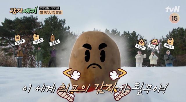 제주도 설원에 덩그러니 놓인 대왕감자 뒤로 여섯 감자 이선빈, 강태오, 이학주, 김가은, 유승목, 남현우가 귀여운 '감자송'에 맞춰 올망졸망 모습을 드러낸다.