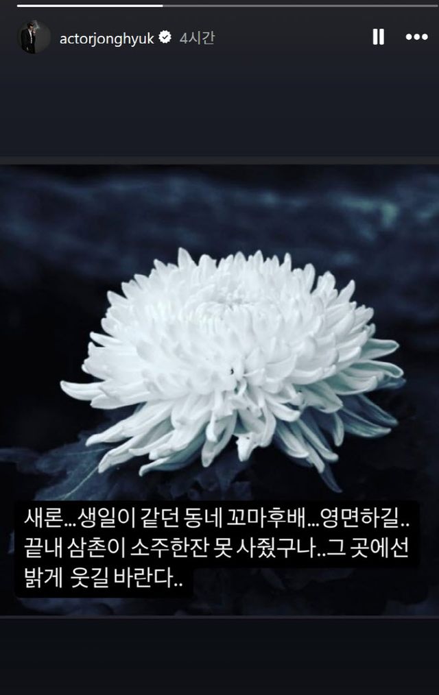 이종혁은 18일 자신의 사회관계망서비스(SNS)에 “새론...생일이 같던 동네 꼬마 후배”라며 “영면하길”이란 문구와 함께 애도를 의미하는 흰 국화꽃 한송이 사진을 게재했다.