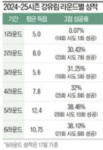 강유림은 시즌 초 슛 감각이 흔들렸다. 2020~21시즌 신인상을 받은 그는 2022~23시즌 3점 성공률 36.7%(시즌 5위)를 기록하고 기량 발전상을 받았다. 하지만 3점 성공률이 지난 시즌 20.9%까지 떨어지며 주춤했다. 올 시즌도 기복을 겪었다. 1라운드 평균 5득점에 그치는 등 4라운드까진 평균 6.6득점을 기록했다. 하지만 5라운드 평균 12.4점, 6라운드 평균 10.75점으로 시즌 막판 득점력을 되살렸다. 4라운드까지 26.92%였던 그의 3점 성공률도 5라운드 이후엔 38.3%로 회복했다.