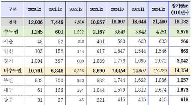 국회 강민국 의원실에서 요청한 국토교통부 '시․도별 미분양 주택 현황'에 따르면 지난해 12월 기준 전국에 악성 미분양으로 불리는 준공 후 미분양 주택 수는 무려 2만1480호다. 이 중 비수도권이 1만7229호로, 전체 80.2%가 비수도권에 집중됐다.