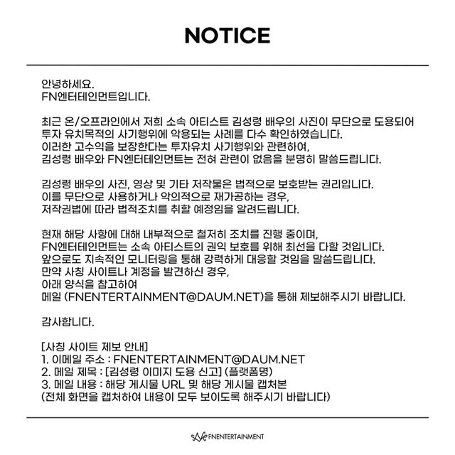 그러면서 소속사는 "현재 해당 사항에 대해 내부적으로 철저히 조치를 진행 중이며, FN엔터테인먼트는 소속 아티스트의 권익 보호를 위해 최선을 다할 것"이라며 사칭 사이트나 계정에 대해 제보를 받는다고 밝혔다.
