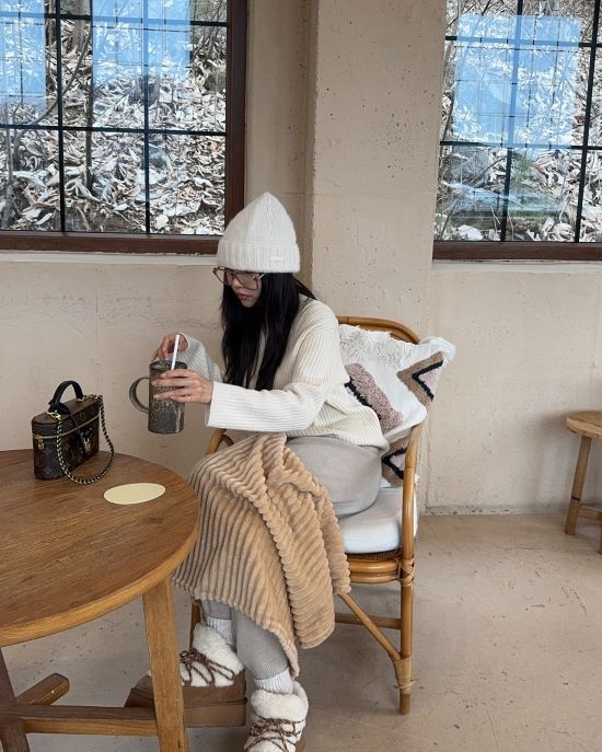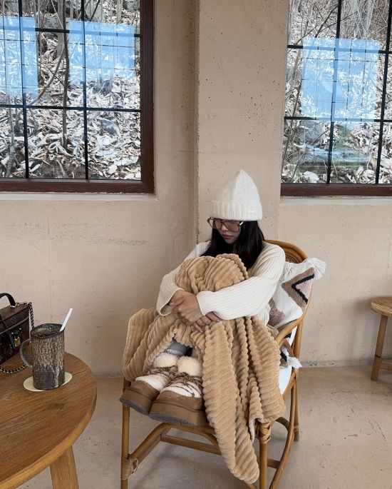 사진 속에는 알이 큰 안경과 모자로 얼굴의 반을 가린 이솔이가 담요를 두른 채 의자에 앉아있는 모습이 담겨 있다.