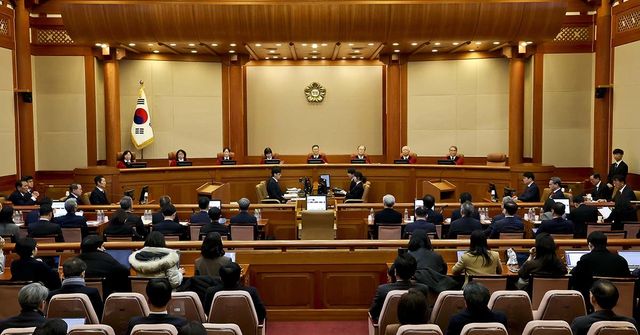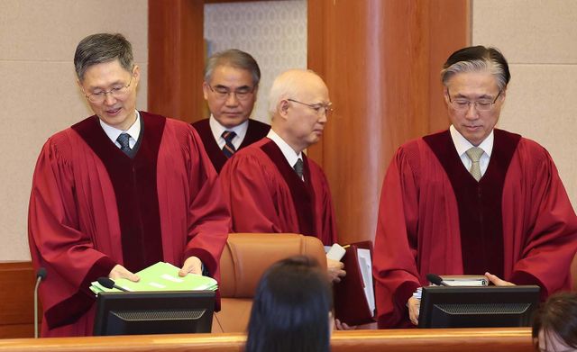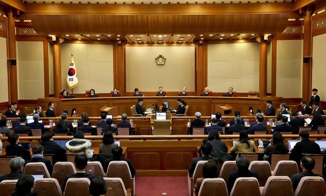 문형배 헌법재판소장 권한대행을 비롯한 헌법재판관들이 18일 서울 종로구 헌법재판소에서 열린 '윤석열 대통령 탄핵심판 9차 변론'에 입장해 있다. / 뉴스1