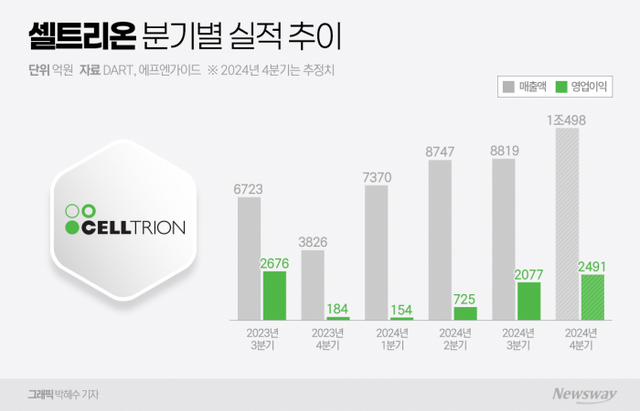 18일 금융정보업체 에프앤가이드에 따르면 셀트리온의 지난해 4분기 매출과 영업이익 컨센서스(증권사 전망치 평균)는 각각 1조498억원, 2491억원으로 예상된다. 전년 동기와 견줬을 때 매출은 174.39%, 영업이익은 1128.8% 확대된 규모다. 셀트리온은 2023년 4분기 매출 3826억원, 영업이익 184억원을 거둔 바 있다.