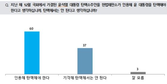 같은 조사에서 윤석열 대통령 탄핵 찬반을 물은 결과 '탄핵찬성'은 60%, '탄핵반대'는 37%로 집계됐다.