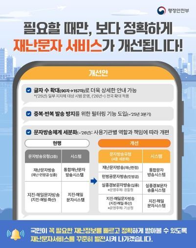 국민이 꼭 필요한 재난정보를 빠르고 정확하게 받아볼 수 있도록 재난문자서비스를 꾸준히 발전시켜 나가겠습니다.