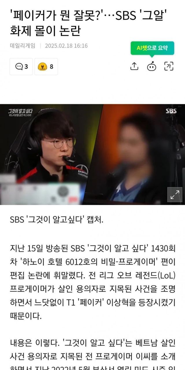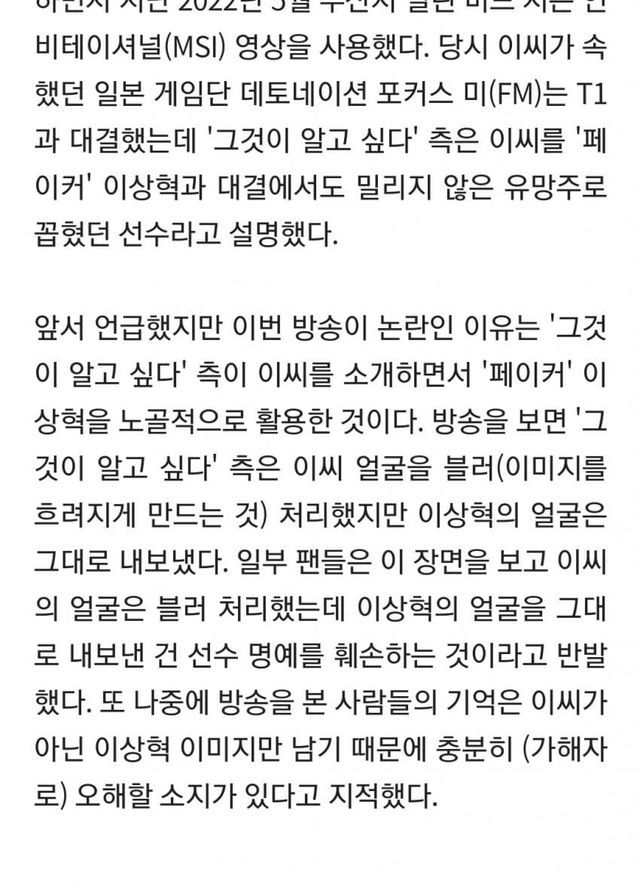 걔는 모자이크 처리 됐는데 페이커는 그냥 그대로 나와서 말 나오는거