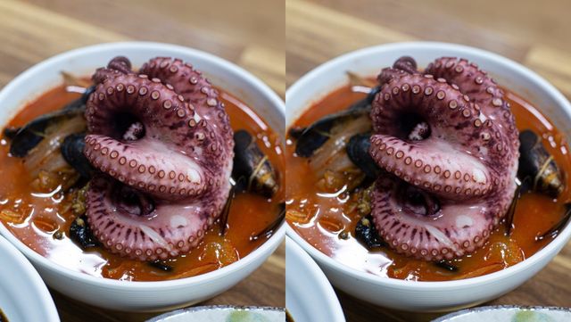 이곳의 대표 메뉴 통문어짬뽕전골은 진한 불 맛과 바다 향이 어우러진 깊고 얼큰한 국물 맛을 자랑한다. 큼직한 통문어가 그대로 들어가 쫄깃한 식감과 감칠맛을 낸다.
