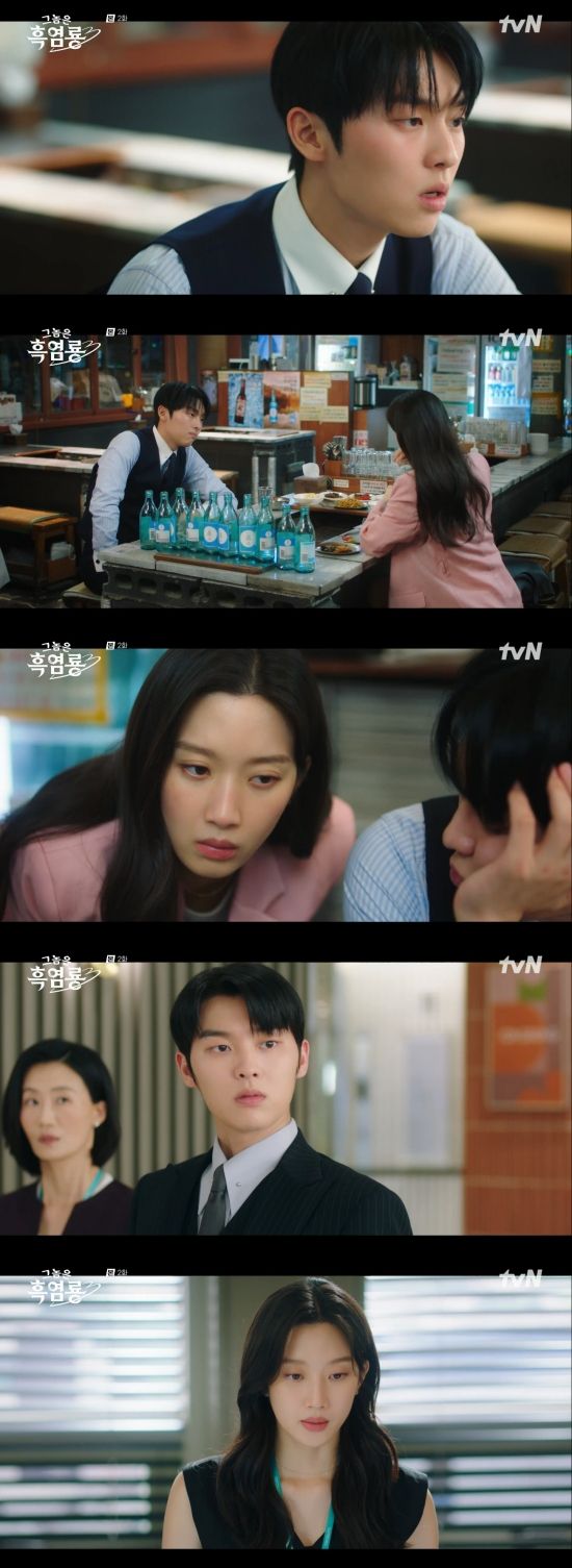 18일 방송된 tvN 새 월화드라마 '그놈은 흑염룡' 2회에서는 반주연(최현욱 분)과 백수정(문가영)이 계약서를 작성한 모습이 그려졌다.
